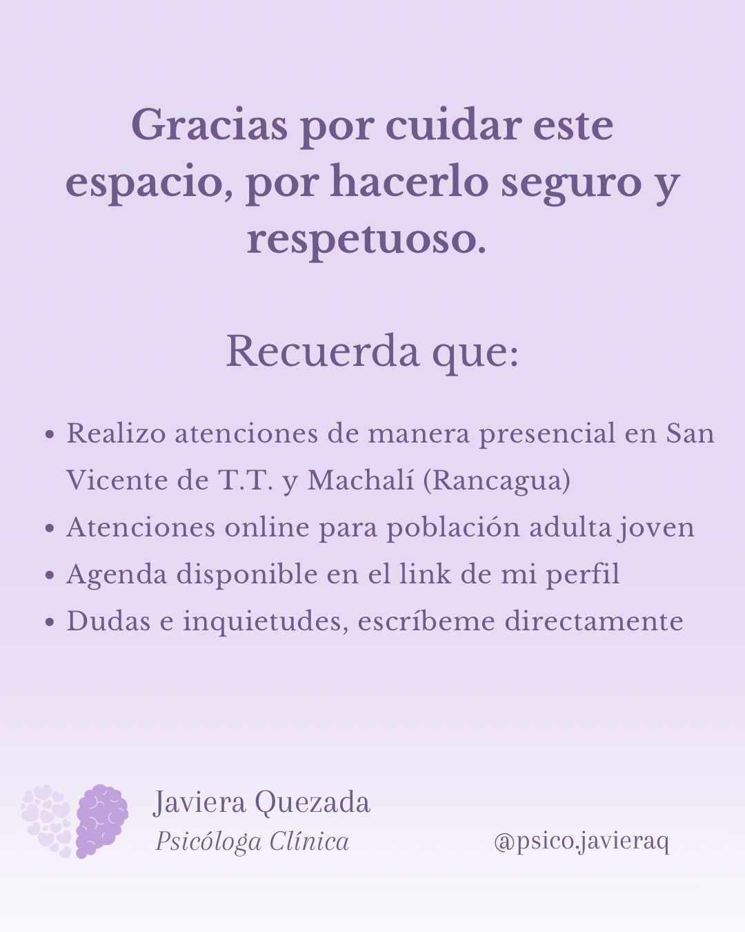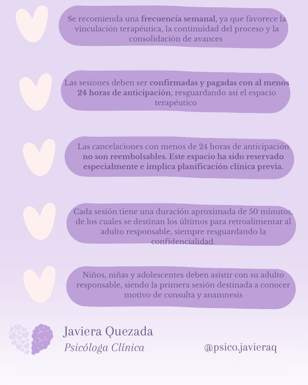 Cuento con diplomados en Psicología Clínica, Psicooncología e Intervención en Abuso Sexual Infantil, además de 5 años de experiencia en el trabajo terapéutico con población infanto-juvenil.